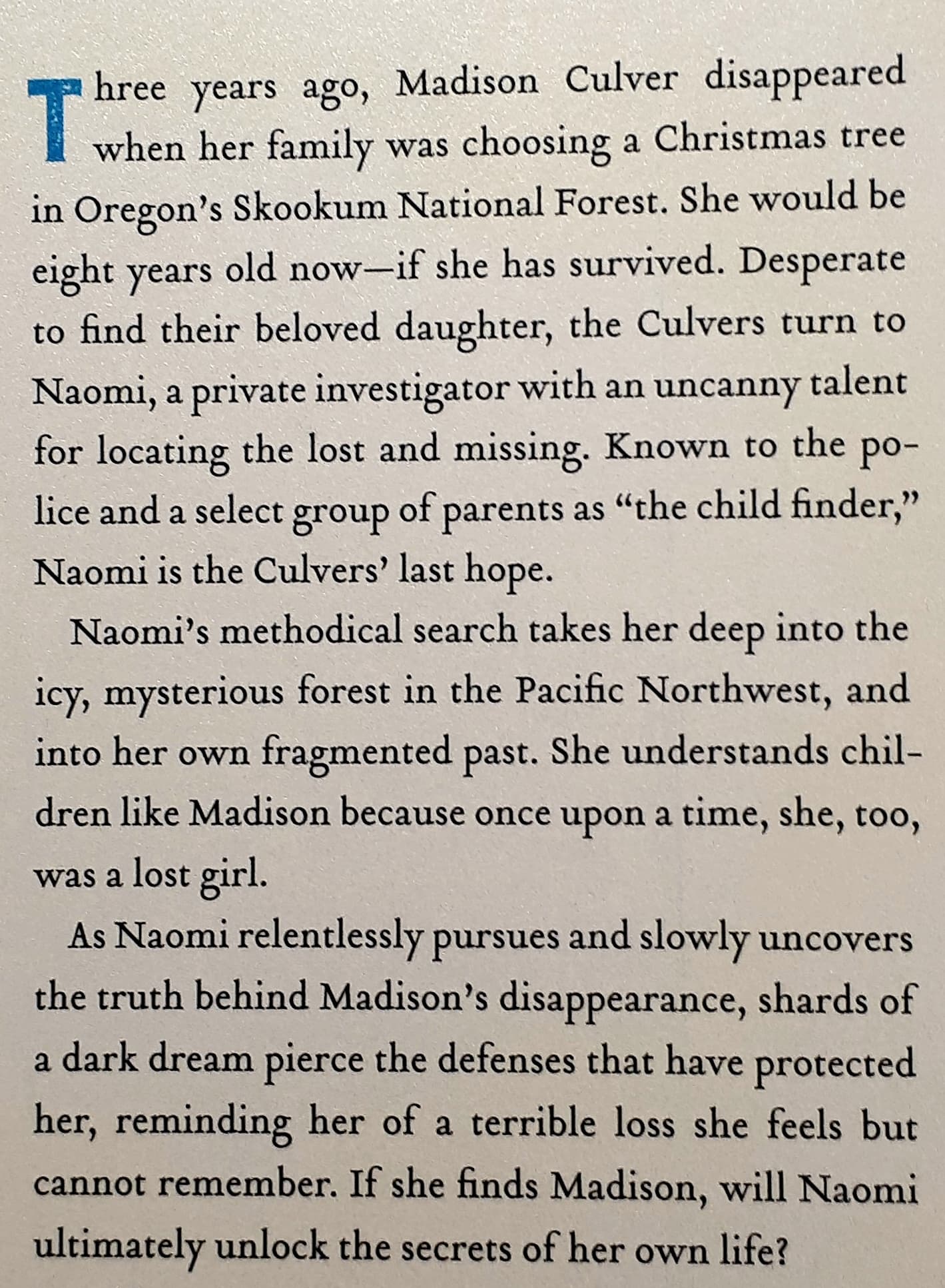 Told in alternating voices, The Child Finder is a magnificent, deeply atmospheric, and exquisitely rendered literary page-turner about redemption, the line between reality and memories and dreams, and the human capacity to survive.