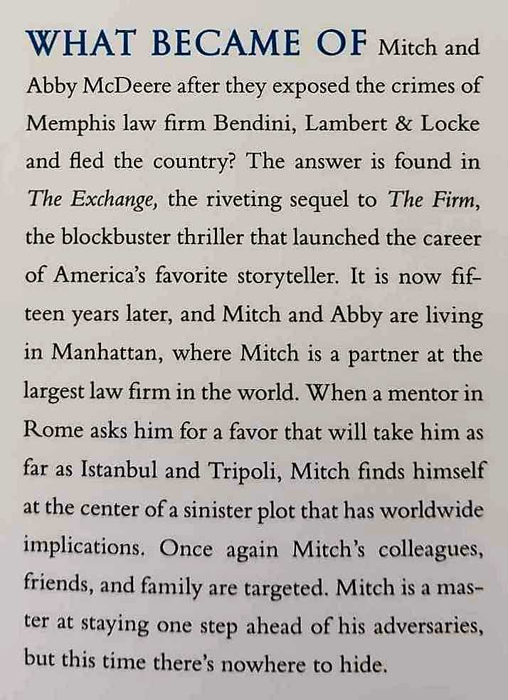 John Grisham delivers high-flying international suspense in The Exchange, a stunning new legal thriller that marks the return of Mitch McDeere, the brilliant hero of The Firm, as he finds himself at the center of a sinister plot that has worldwide implications.
