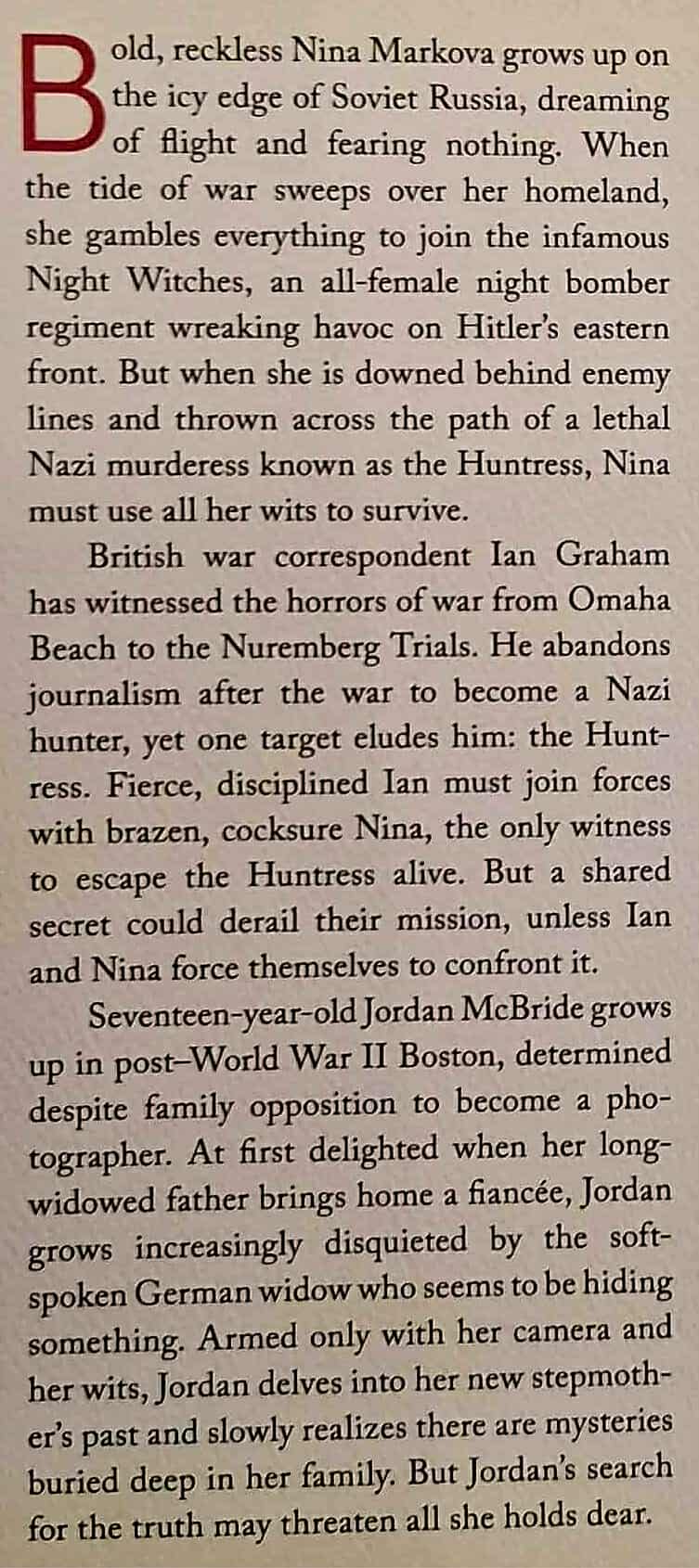The Huntress is a fascinating historical novel about a battle-haunted English journalist and a Russian female bomber pilot who join forces to track the Huntress, a Nazi war criminal gone to ground in America.