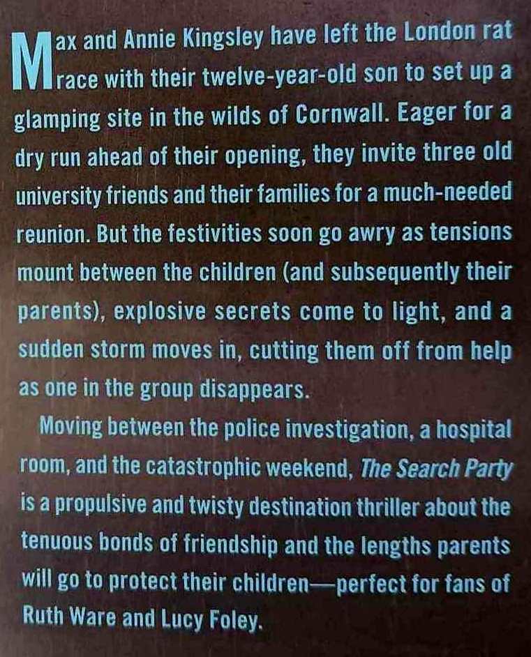 A spellbinding locked-room mystery, The Search Party is a propulsive and twisty destination thriller about the tenuous bonds of friendship and the lengths parents will go to protect their children, and makes a perfect choice for fans of Ruth Ware and/or Lucy Foley.