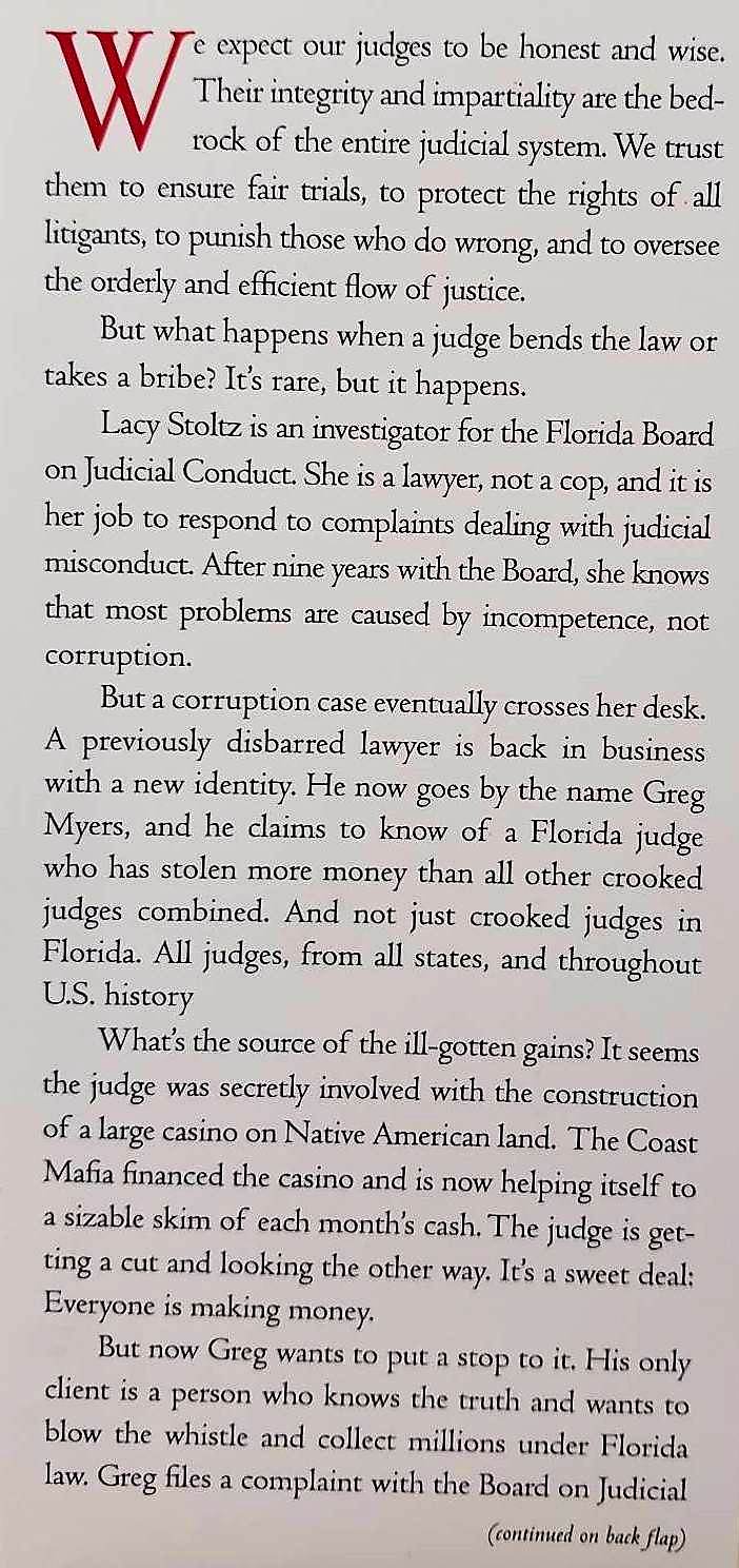 An investigator for the Florida Board on Judicial Conduct, Lacy Stoltz is used to complaints dealing with judicial misconduct being caused by incompetence, not corruption, but when a corruption case eventually crosses her desk things turn from dangerous to deadly . . .