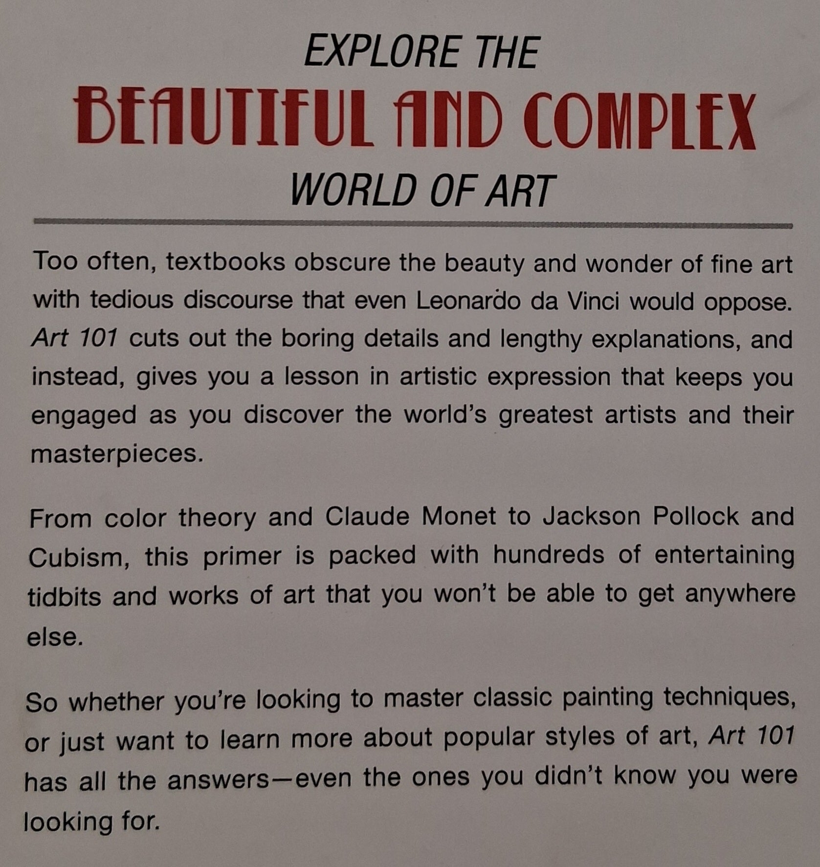 Cutting out the boring details and lengthy explanations, Art 101 allows anyone to explore the beautiful and complex world of art with lessons in artistic expression that keep readers engaged as they discover the world's greatest artists and their masterpieces.