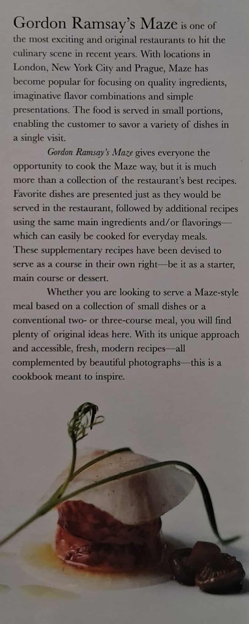 A must have for chefs, cookbook collectors, and certainly recommended for those who love the art of food, Gordon Ramsay's Maze contains a wide-variety of fantastic restaurant-style dishes, as well as home-style fare, with most recipes being grouped by ingredient so readers can see a variety of plates utilizing the same core ingredients.