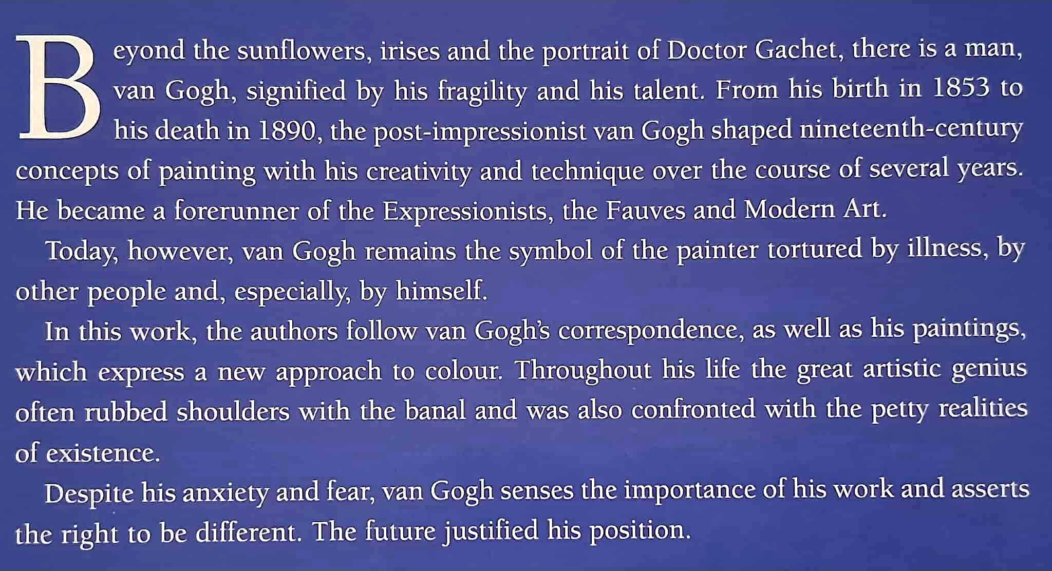 Van Gogh shaped post-impressionist nineteenth-century concepts of painting with his creativity and technique becoming a forerunner of the Expressionists, the Fauves, and Modern Art. Today, however, van Gogh remains the symbol of the painter tortured by illness, circumstance, other people, and himself . . .
