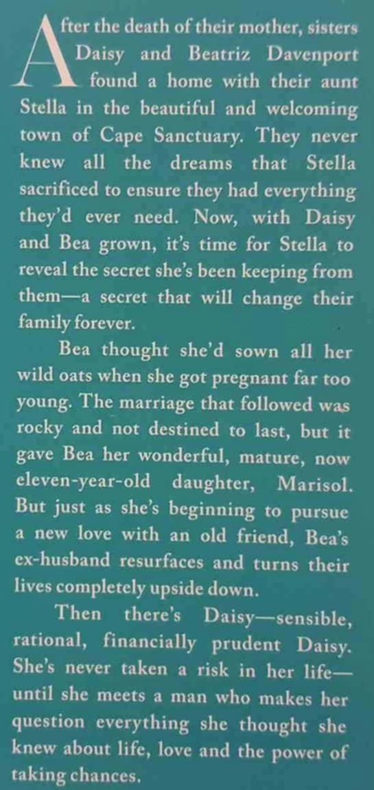 Beatriz, Daisy, and Stella (two sisters and their aunt) find a home in a cliff house located on the northern California coast in the beautiful and welcoming town of Cape Sanctuary, where they discover that the path to true happiness is filled with twists and turns, but love always leads them back home . . .