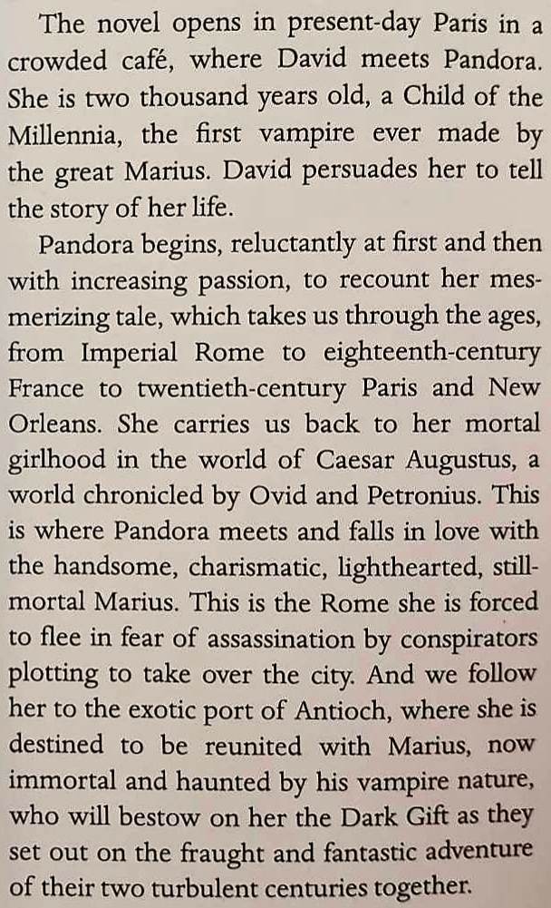 Framed as the narrative that Pandora writes at the request of David Talbot, a relatively new vampire, after their meeting in Paris, the tale begins in ancient Rome where she meets Marius, her great love and the being who will change her into one of the Undead . . .