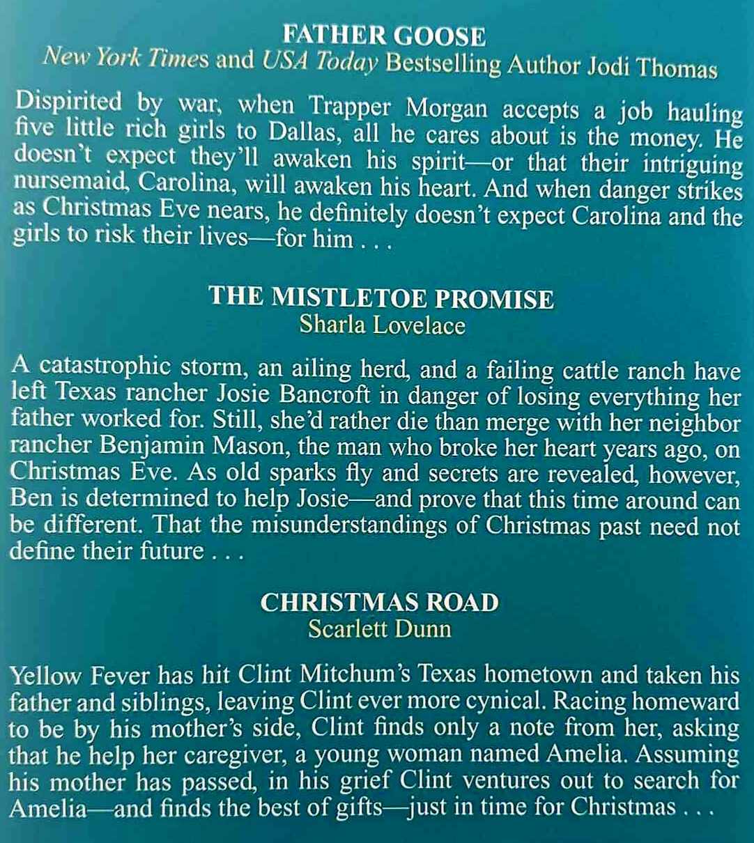 A delightful collection of western themed holiday stories of romance and adventure, The Cowboy Who Saved Christmas features three engagingly fetching tales: 1) Father Goose by Jodi Thomas, 2) The Mistletoe Promise by Sharla Lovelace, and 3) Christmas Road by Scarlett Dunn.