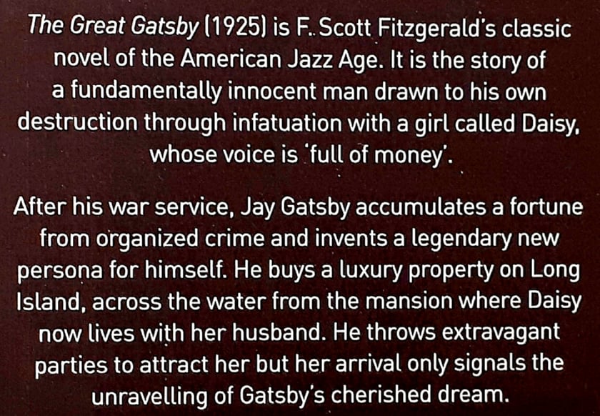 The Great Gatsby is the story is of the fabulously wealthy Jay Gatsby and his new love for the beautiful Miss Daisy Buchanan, of lavish parties on Long Island at a time when The New York Times noted "gin was the national drink and sex the national obsession," and is an exquisitely crafted tale of America in the 1920s.