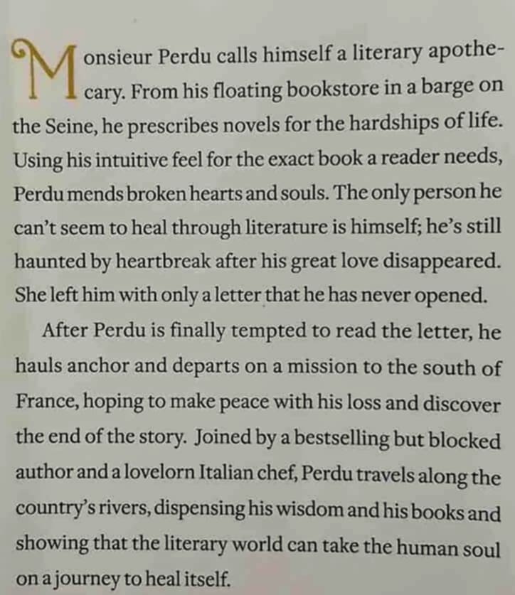 Floating bookshop owner Monsieur Perdu can prescribe the perfect book for a broken heart from his barge along the River Seine, but can this literary apothecary fix his own . . . ?