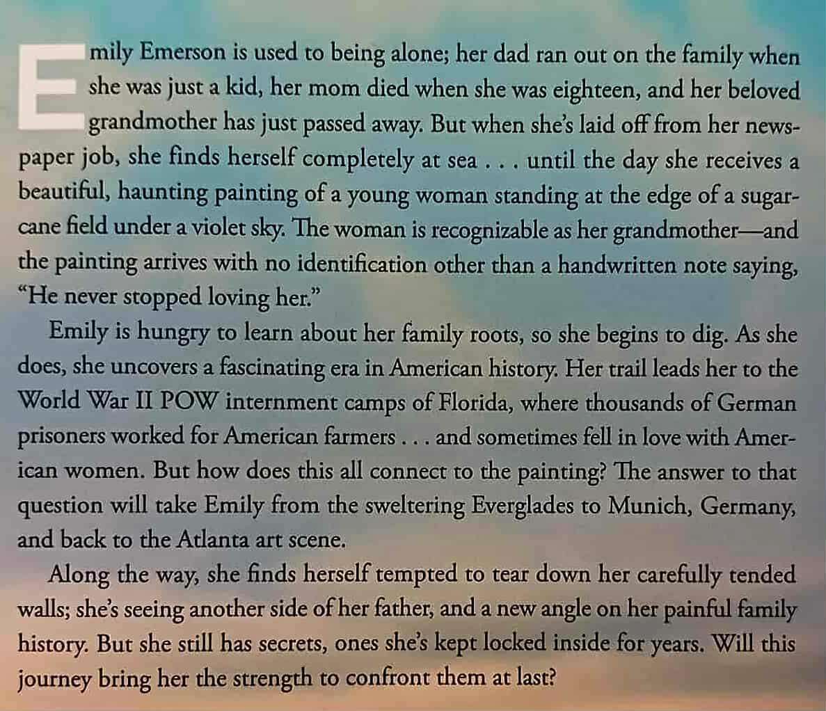 Having no family of her own anymore, and then being laid off from her job as a reporter Emily Emerson thinks that she has lost everything, until a mysterious painting leads her to what she wants most in the world . . .