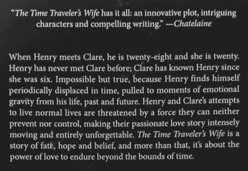 An intricate love story about a man, a librarian at the Newberry Library in Chicago with a genetic disorder that causes him to time travel unpredictably, and about his wife, an artist who has to cope with his frequent absences and dangerous experiences . . .