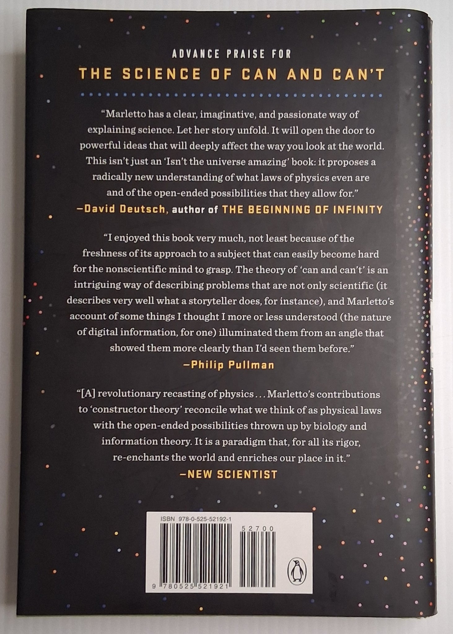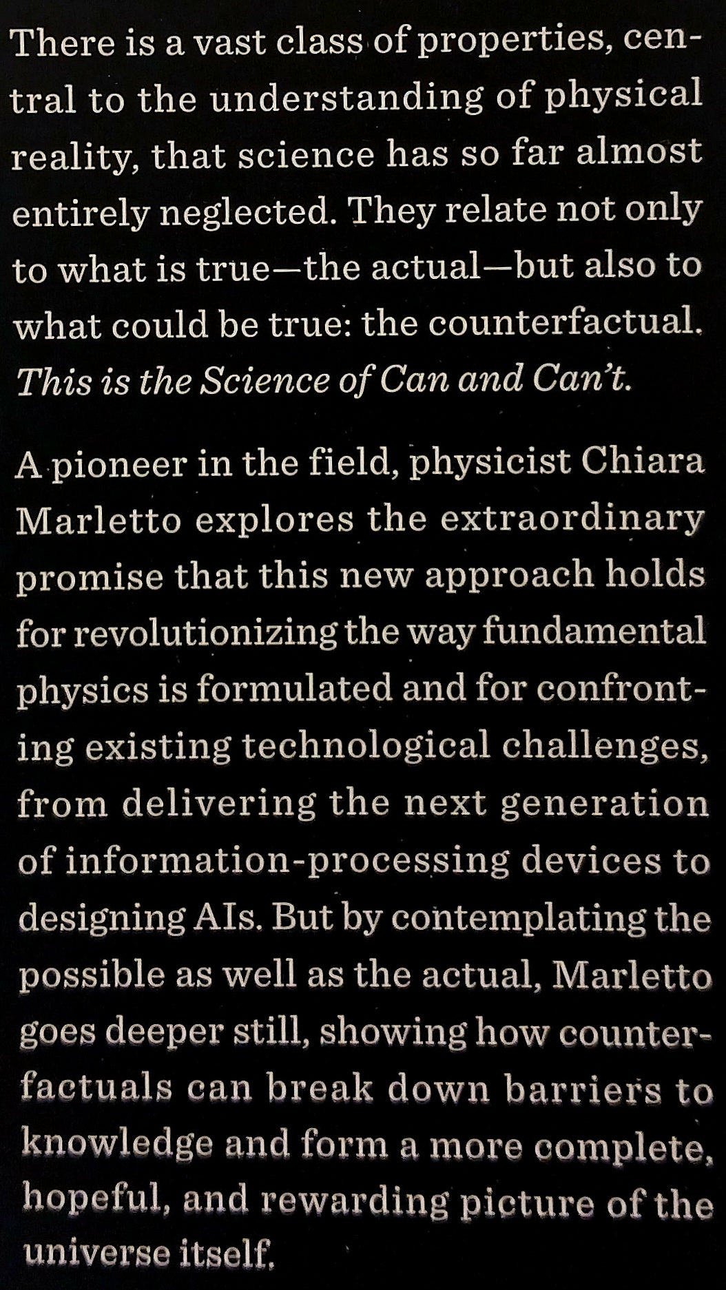"Marletto’s contributions to ‘constructor theory’ reconcile what we think of as physical laws with the open-ended possibilities thrown up by biology and information theory. It is a paradigm that, for all its rigor, re-enchants the world and enriches our place in it.” -- New Scientist
