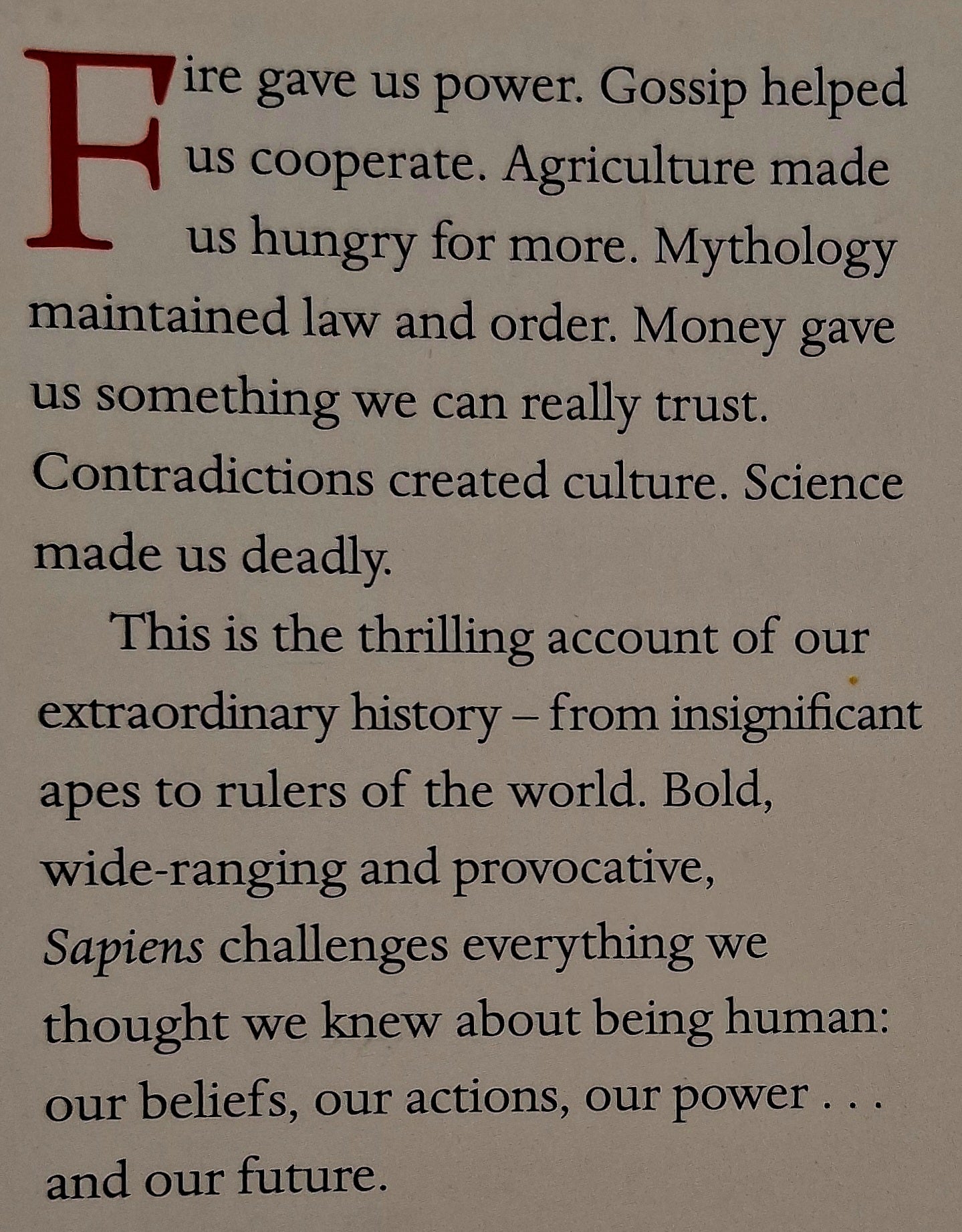 Bold, wide-ranging and provocative, Sapiens challenges everything we thought we knew about being human: our thoughts, our actions, our power, and our future.