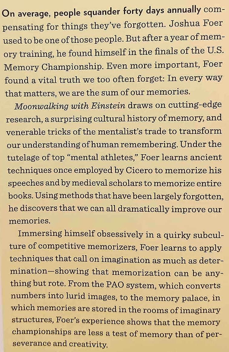 Charting an amazing journey of the mind while revolutionizing the common  concept of memory, Moonwalking with Einstein is an electrifying work of journalism that reminds us that, in every way that matters, we are in fact the sum of our memories.