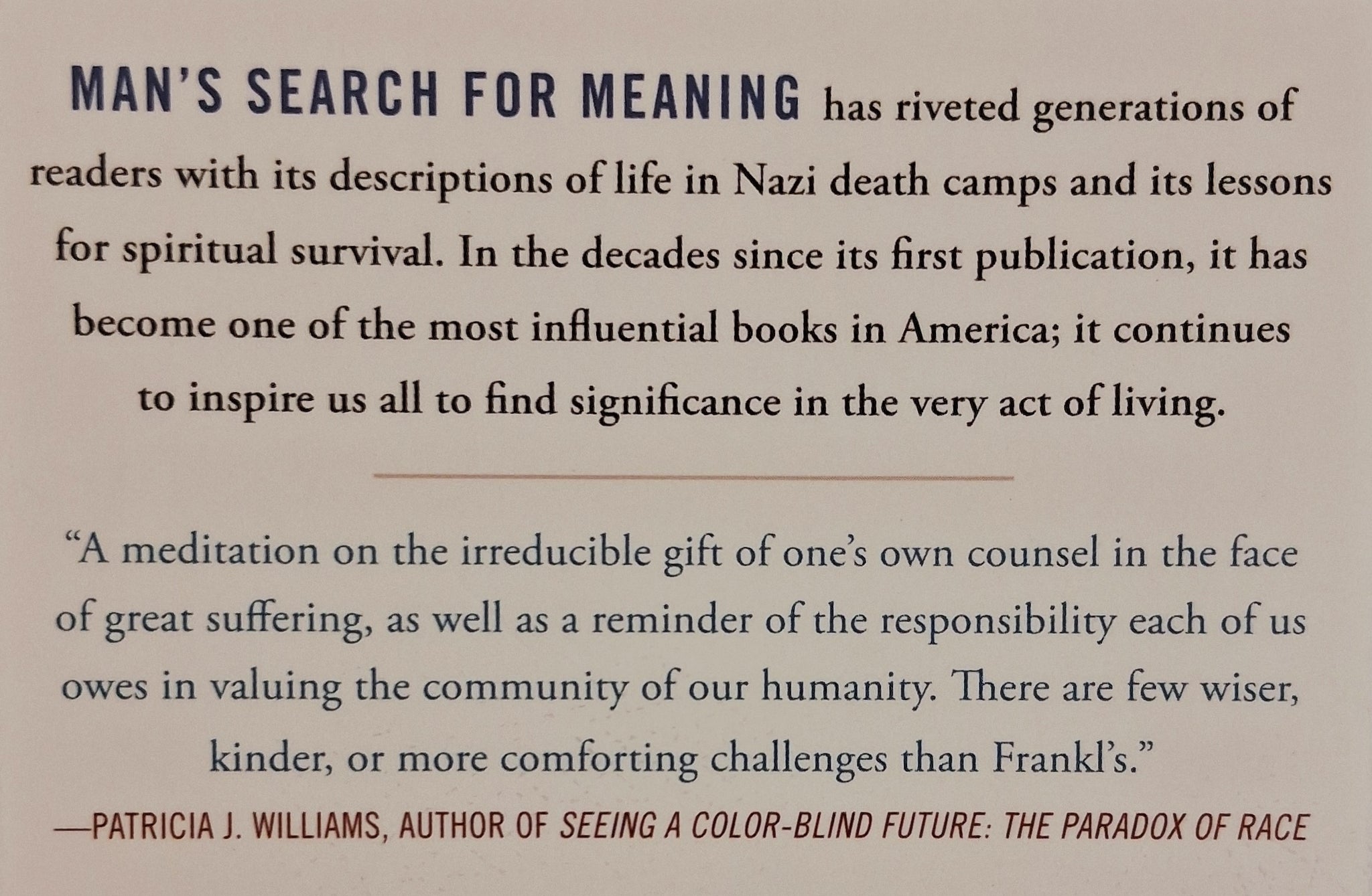 Having become one of the most influential books in modern America, Man's Search for Meaning continues to inspire its readers to find significance in the very act of living. This edition is presented with a new foreword by Rabbi Laureate of Temple Israel in Natick, Massachusetts and bestselling author of When Bad Things Happen to Good People and Living a Life That Matters, Harold S. Kushner.