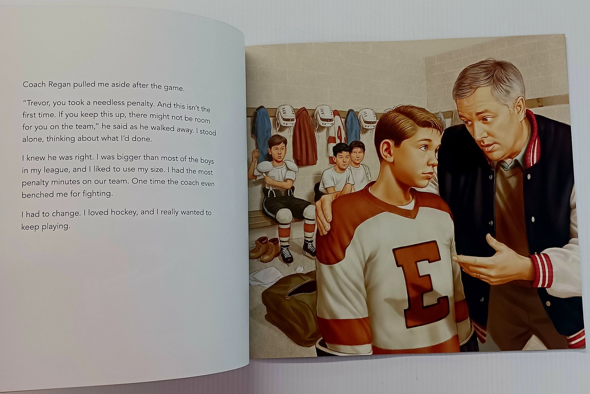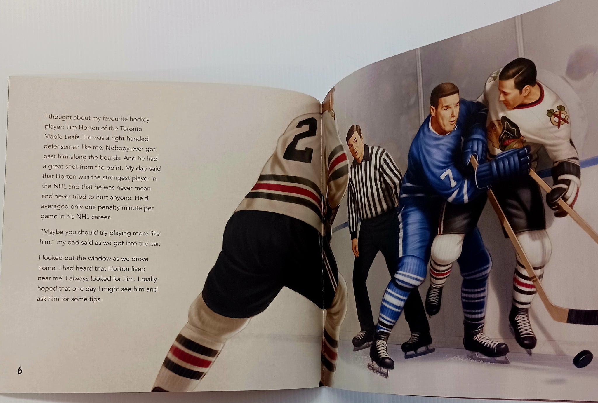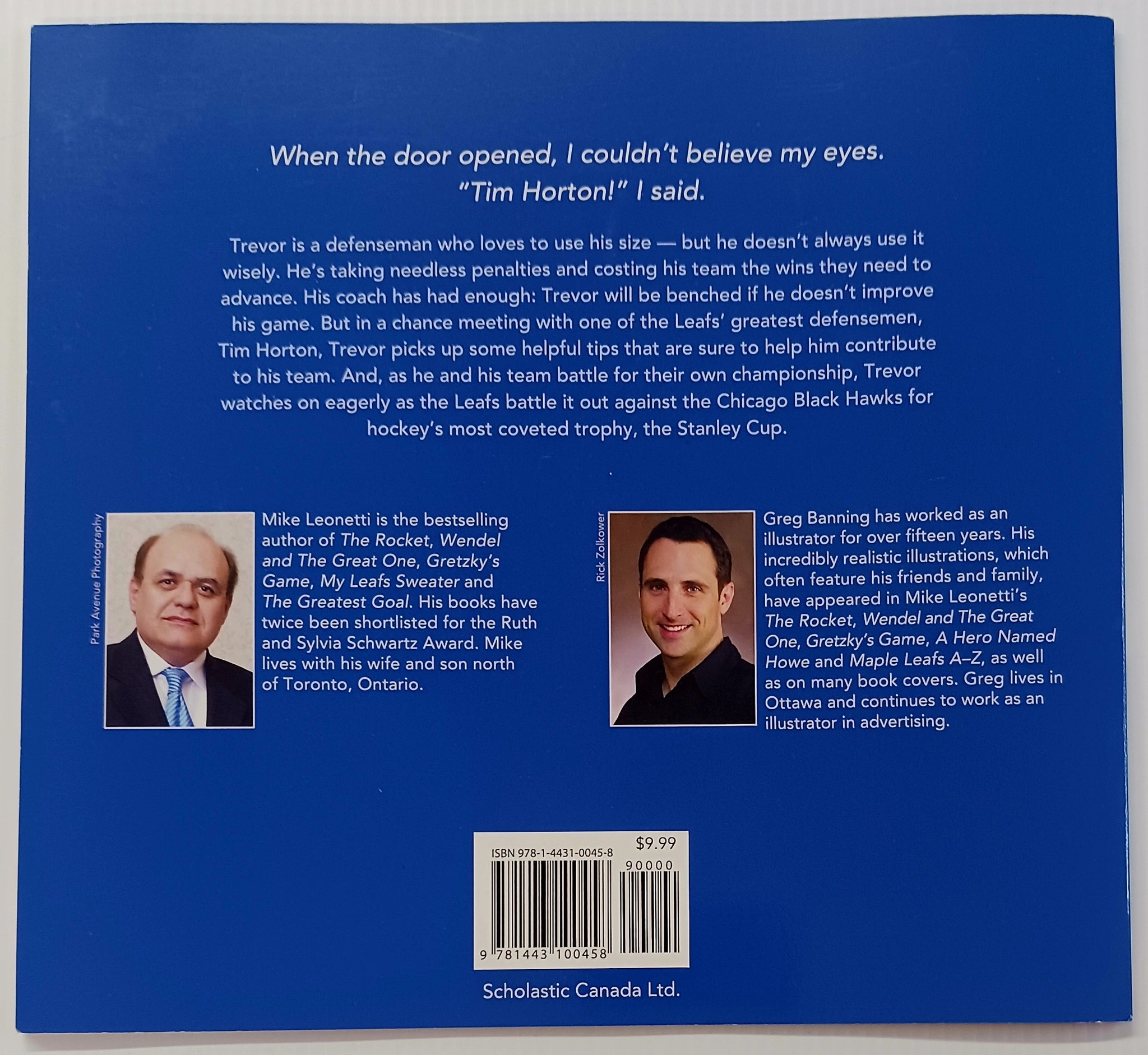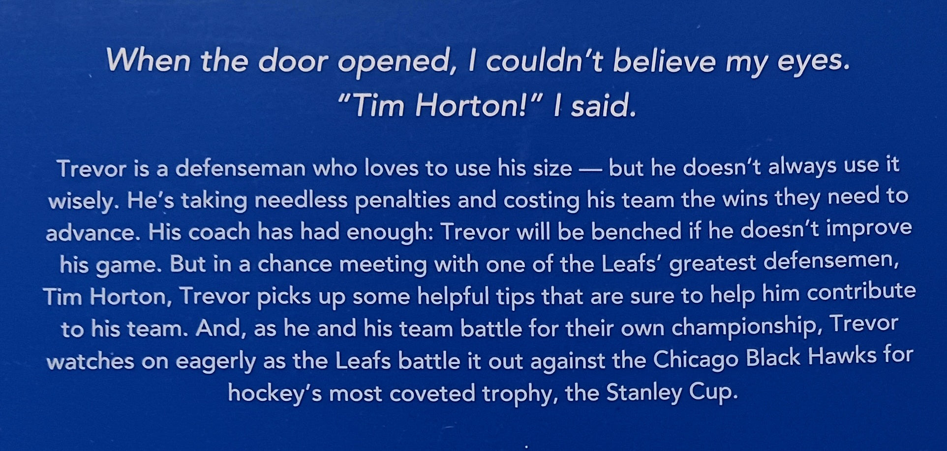 As a defenseman, Trevor loves to use his size in his game (sometimes a little too much), taking needless penalties and costing his team the wins they need to advance.  He hates letting them down, but he doesn't know how to change his game, but as the Leafs head for the Cup in the 1961-62 season, he follows the plays of his hockey hero, Tim Horton. for inspiration.  Horton is a big defenseman too, but he uses his size wisely . . .