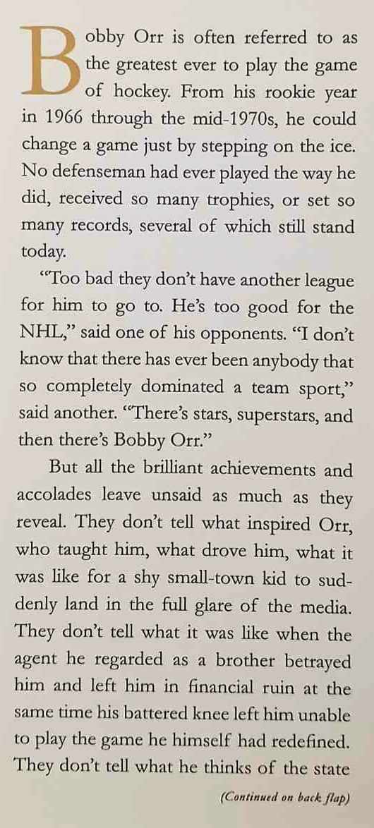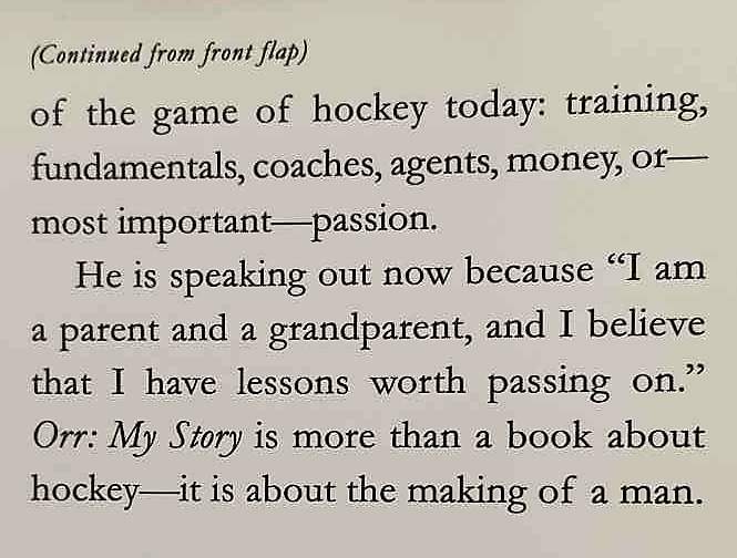 “A reflection on the nostalgia of playing hockey on frozen ponds growing up in Parry Sound, Ontario, the physical and emotional pain of knee injuries that cut his career short, and the off-ice struggles that the legendary Boston Bruins defenceman hasn’t talked much about.  Orr is a how-to book by a grandparent about how parents, coaches, and children should approach the sport.” --  The Canadian Press