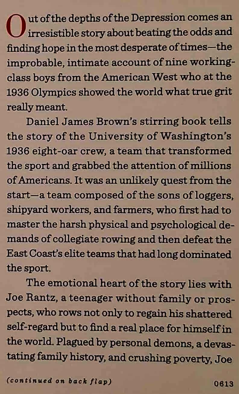 Daniel James Brown has created a portrait of an era that is both a celebration of a remarkable achievement, and a chronicle of one extraordinary young man's personal quest all in one immensely satisfying book.