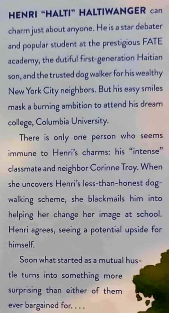 Star debater and popular student at the prestigious FATE Academy, Henri “Halti” Haltiwanger can charm just about anyone. The only person who seems immune to Henri’s charms is his 'intense' classmate and neighbor Corinne Troy. When Corinne discovers something about Henri that he would like to keep quiet, she blackmails him into helping her change her image at school. Soon what started as a mutual hustle turns into something more surprising than either of them bargained for. . . .