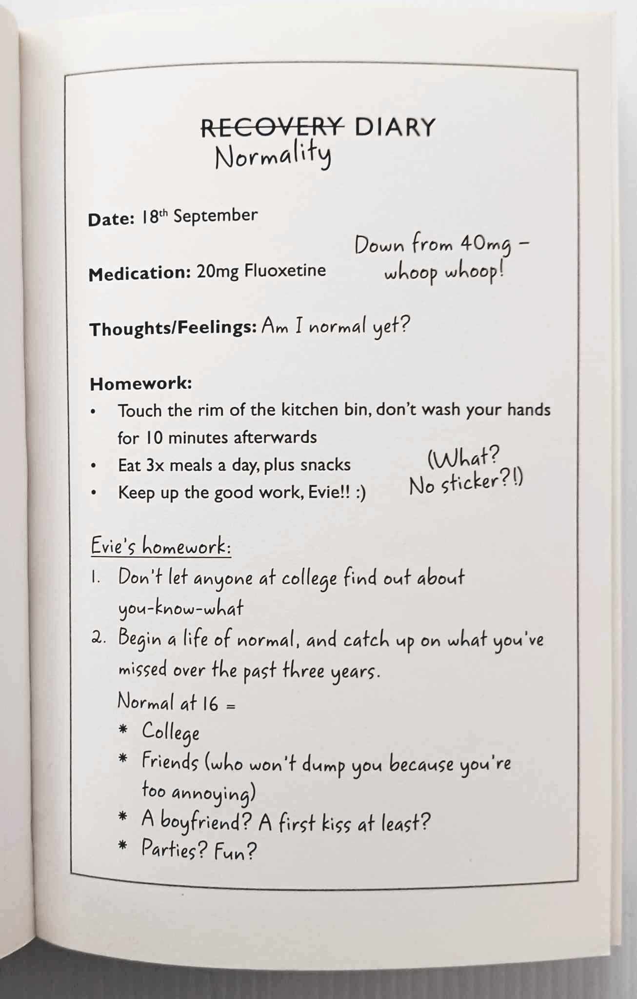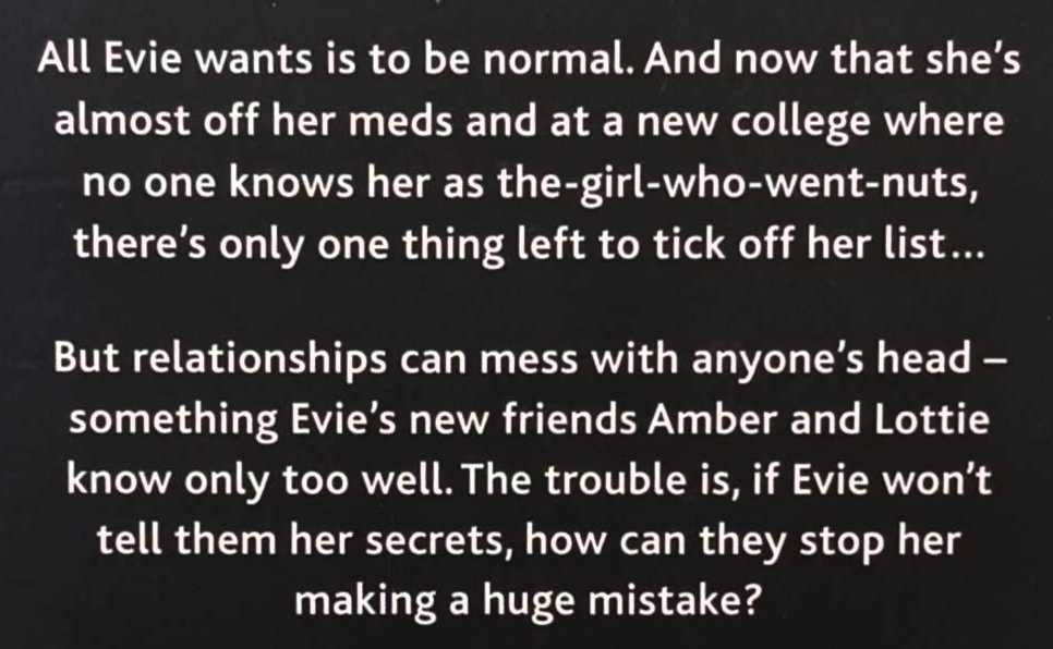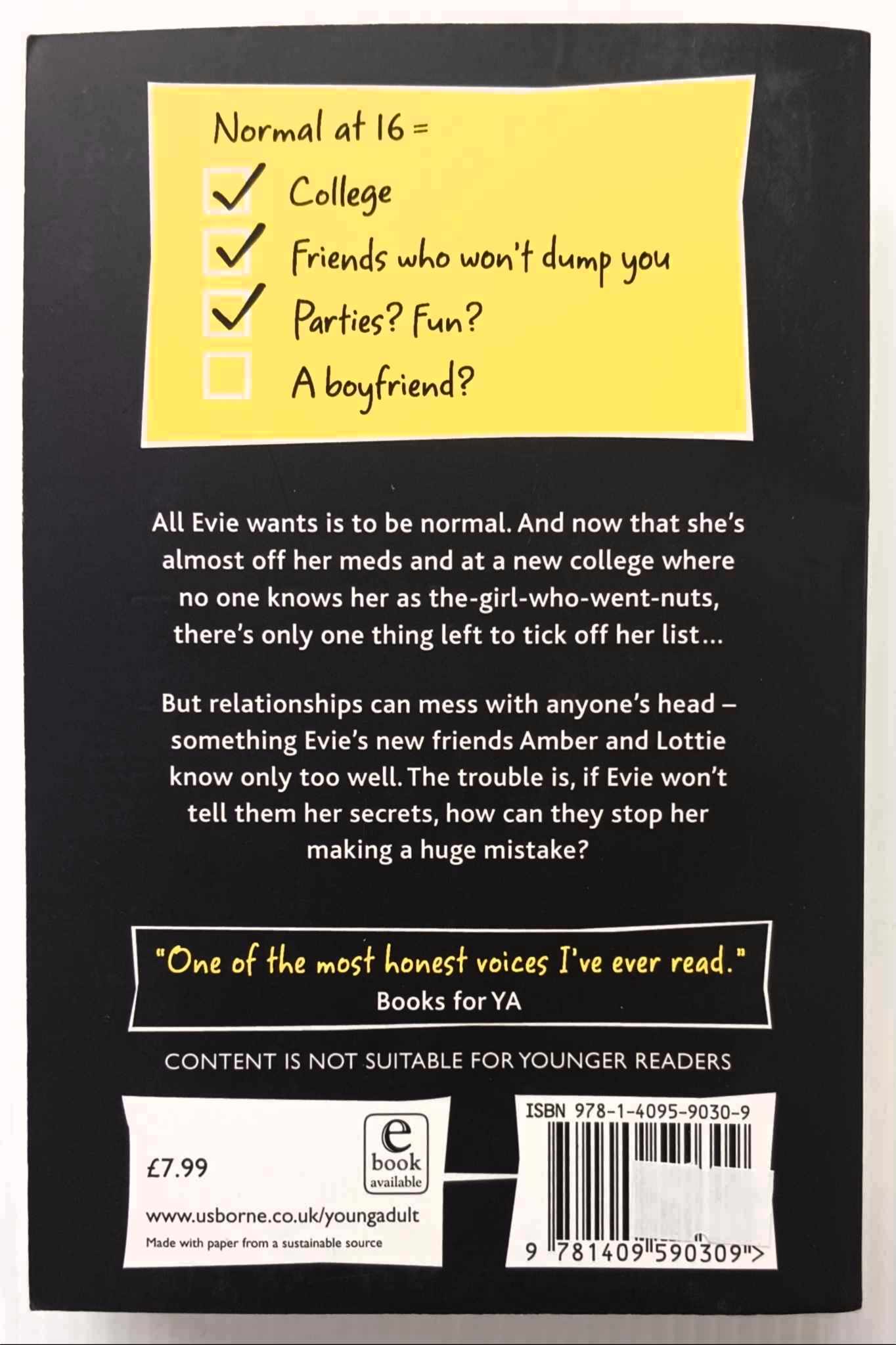 At college, away from her reputation as the girl-who-went-crazy, Evie tries to be normal, make friends, blend in, maybe even go on a date, but relationships are often messy, and if Evie can't even tell her new friends the truth about herself, how will she cope with falling in love . . . ?