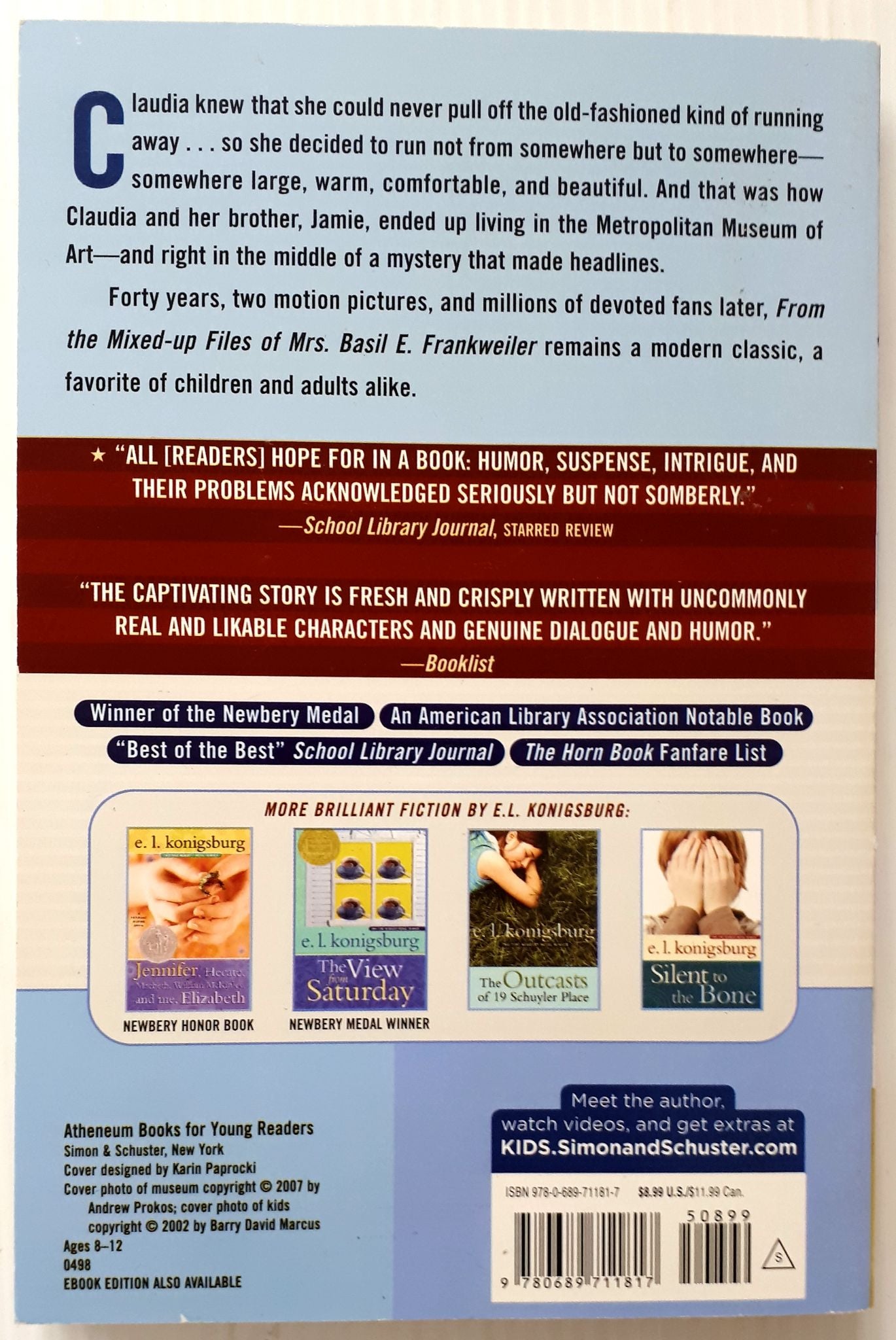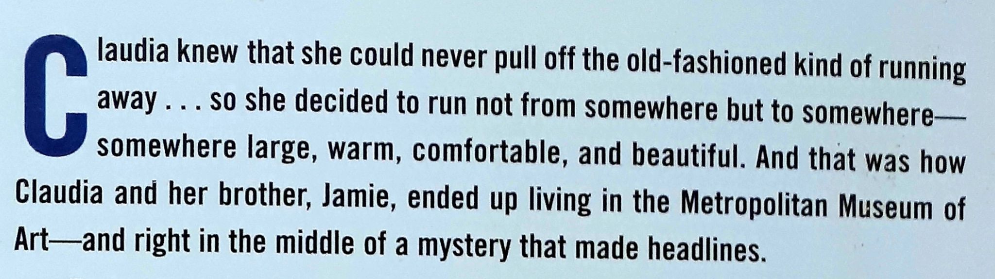 Claudia Kincaid, and her brother Jamie, have run away to the live in the Met. Once settled into the museum, they find themselves caught up in the mystery of an angel statue. Their quest leads Claudia to Mrs. Basil E. Frankweiler, the remarkable old woman who sold the statue, and to some equally remarkable discoveries about herself.