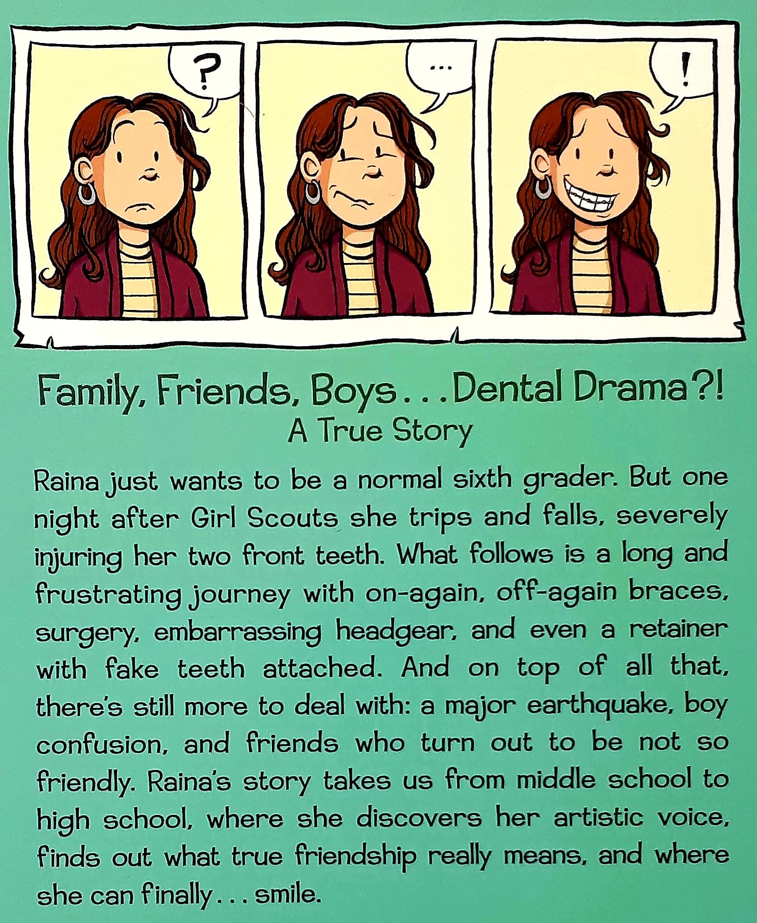 "Raina Telgemeier perfectly captures the small, everyday surprises, dramas, and embarrassments that make up adolescence ... A joy to read!" -- Gene Yang, National Book Award Winning author for American Born Chinese