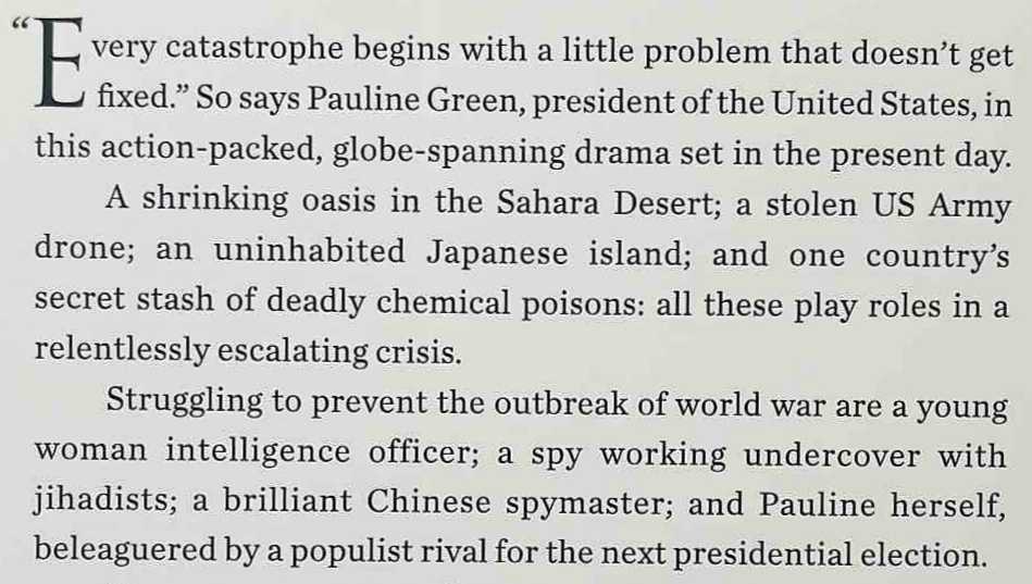 Struggling to prevent the outbreak of world war due to a shrinking oasis in the Sahara desert, a stolen US Army drone, an uninhabited Japanese island, and another country's secret stash of deadly chemical poisons, United States president Pauline Green must team up with a young female intelligence officer, a spy working undercover with jihadists, and a brilliant Chinese spymaster before things escalate to the point of no return . . .